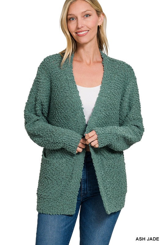 This popcorn cardigan blends cozy comfort with fierce style. Perfect for lounging with leggings and a tee, or easily dressed up with your favorite jeans for a day or night out. Its playful texture adds a fun twist to any outfit.