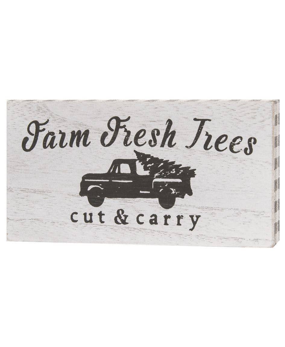 Farm Fresh Trees are freestanding wooden block accessories. They are painted white with a black and white check trim pattern around the border. The blocks feature black text that reads, "Trees for Sale, Fresh Cut, Pine, Spruce, Fir" and "Fresh Cut Trees, Cut and Carry". Measures 3"high by 6" wide by .75" deep. Please note: item features an assortment and are sold individually.