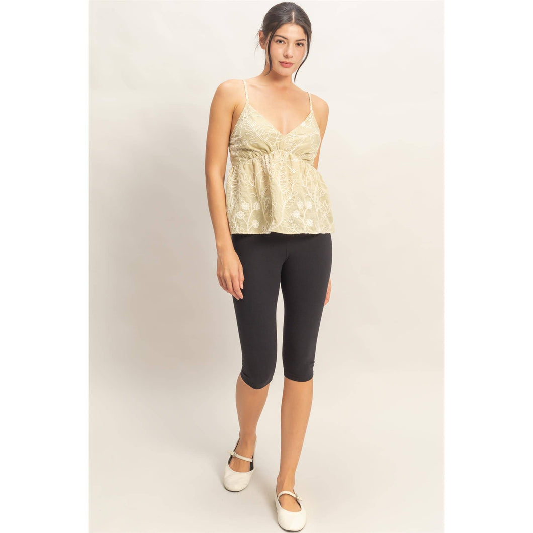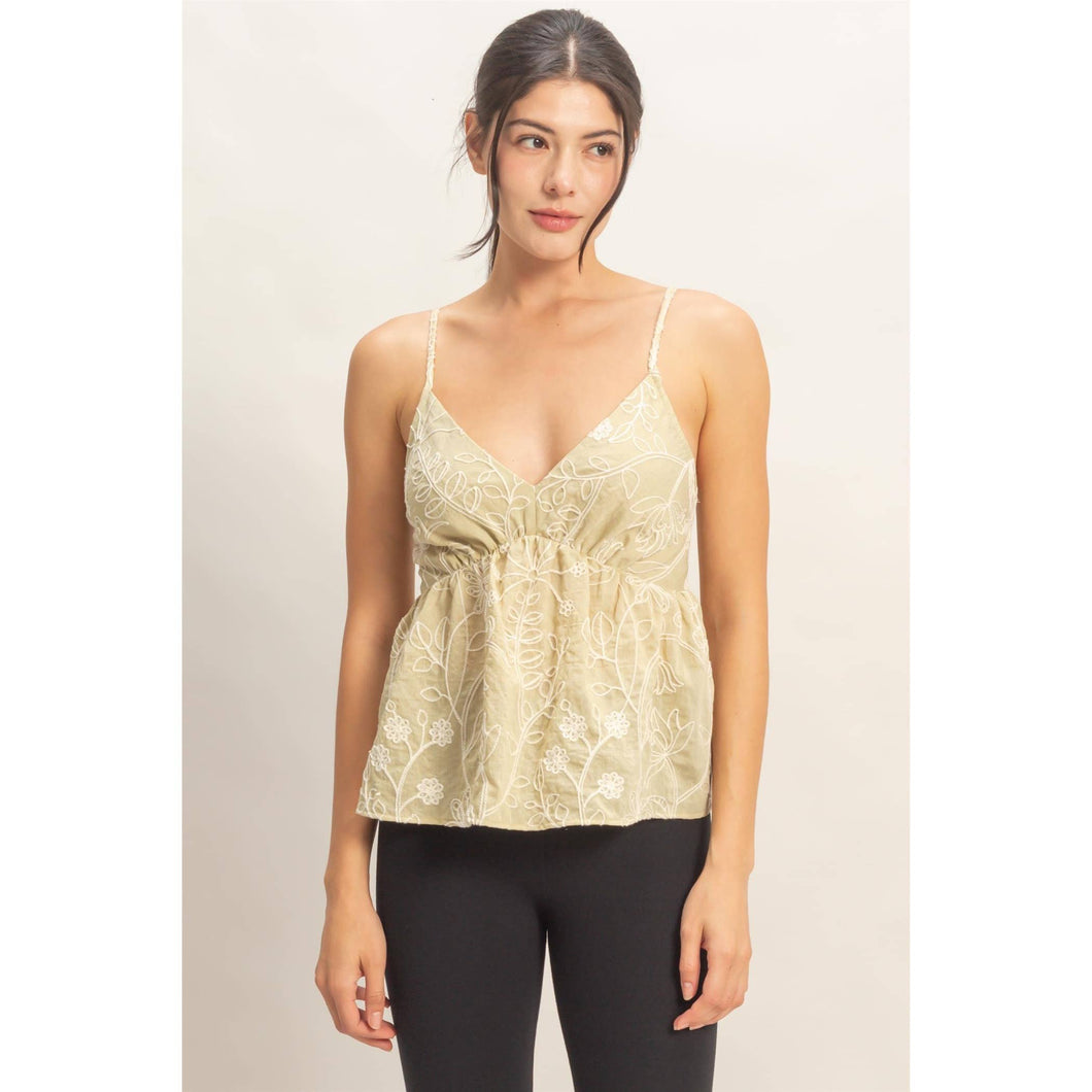 This babydoll top features intricate embroidery and a shirred bust with a smocked detailing for a flattering shape. Adjustable spaghetti straps enhance the V-neck design. Perfectly pair it with your favorite shorts or layer under a denim jacket for a casual vibe. 71% rayon 25% polyamide 4% linen Model Is 5' 8" Tall, 32" Chest, 25" Waist, 35" Hips And Wearing A Size Small