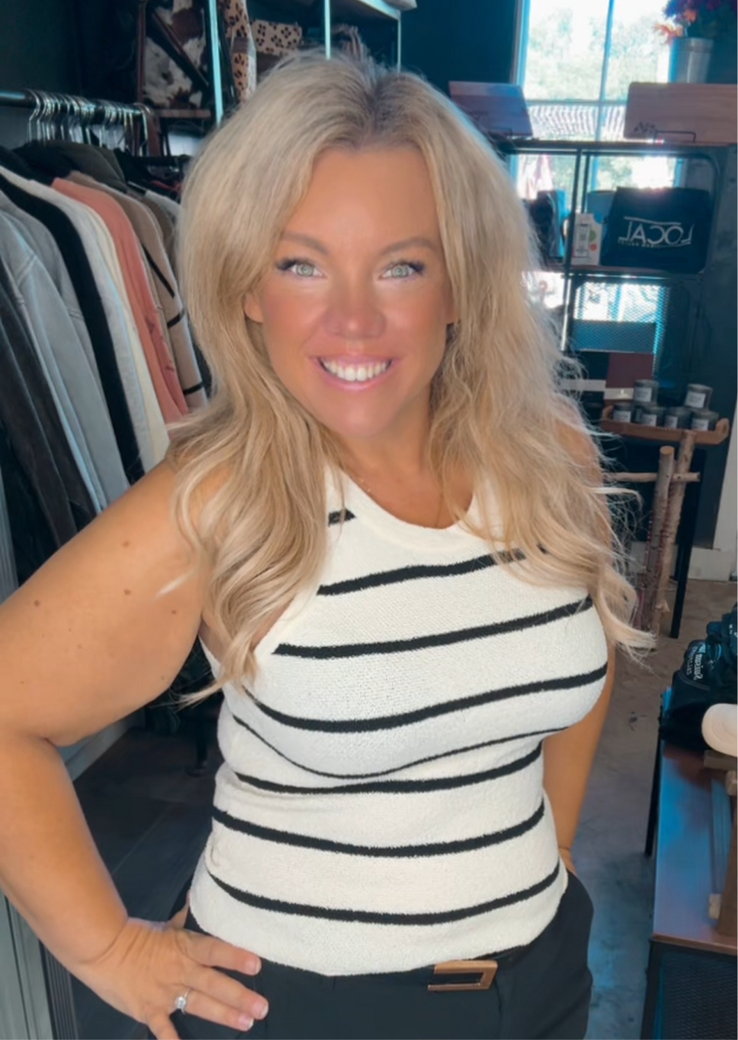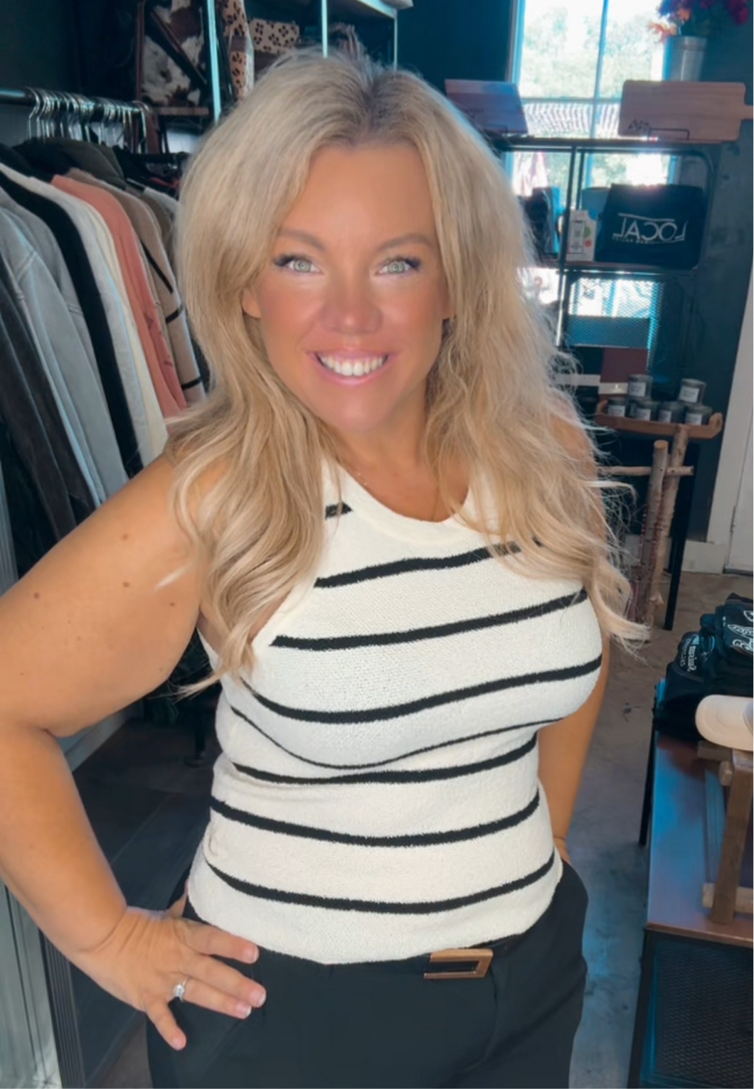 This cream sweater tank top with chic black lines is your all-season wardrobe hero. Cozy yet stylish, it’s perfect for layering under your favorite jacket or wearing solo when you want to keep it cool and comfy. Whether you’re headed to the office or out for fun, it effortlessly blends comfort with a playful edge.