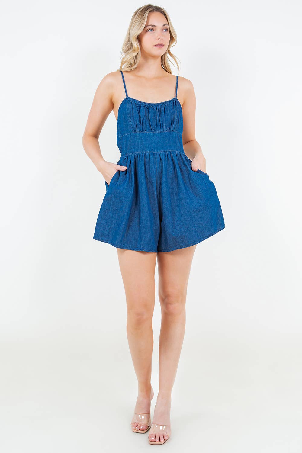 This Denim Smocked Romper is a stylish and versatile addition to any wardrobe. With adjustable spaghetti straps and a smocked bodice, this romper ensures a perfect and comfortable fit. Made of high-quality chambray cotton, it is both durable and fashionable. Perfect for any occasion.